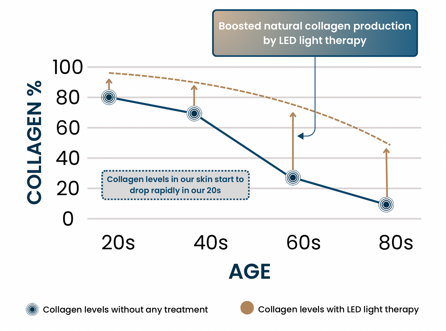 Our LED Mask uses clinics-trusted red LED light (630nm) to stimulate skin cells = Where collagen production begins.